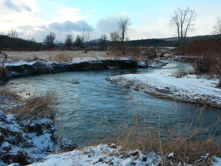 View downstream showing highly sinuous stream with steep, eroding banks and little or no riparian buffer.