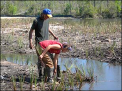 Volunteers plant marsh grass during restoration.