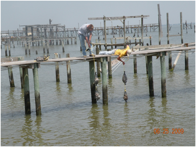 Volunteers put out shell bags to attract spat for the new reef habitat.