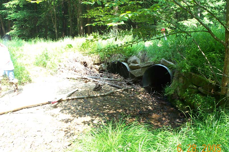 Inlet of culverts on Bobbs Creek in Pennsylvania. Note the accumulation of debris and near complete closure of the culvert on the far left.