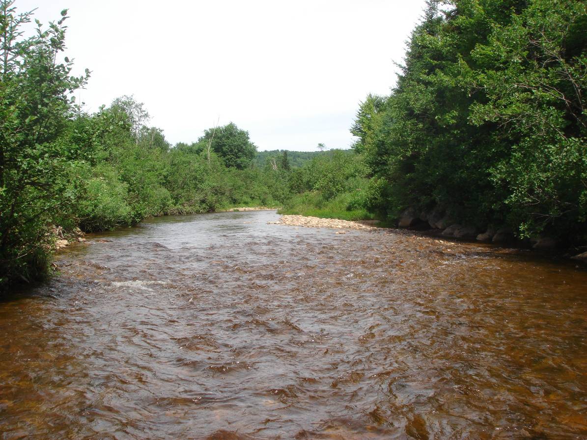 Photo of Nash Stream in Coos County, New Hampshire. Note the shallow, overwidened reach with poor habitat complexity between East Branch and Pond Brook.